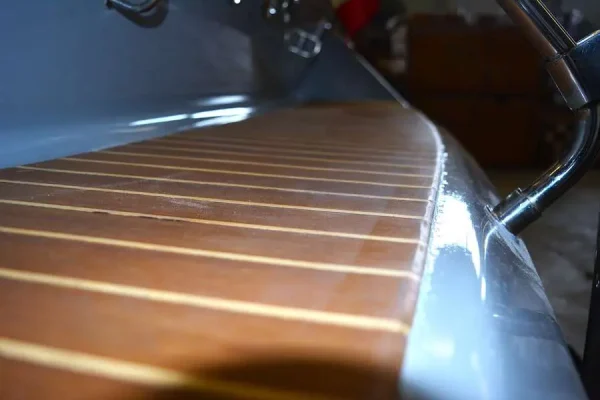 Plancetta con pavimento in teak con scaletta in acciaio.